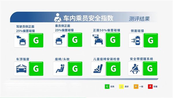 在车内乘员安全的细分测评中,腾势N9在驾驶员侧与乘员侧正25%偏置碰撞、正面50%偏置碰撞、侧面碰撞、车顶强度、座椅/头枕、儿童座椅安装检查、安全带提醒系统等所有项目上,均取得G(优秀)评价。