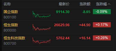 涨0.17%,报26629.96点,恒生科技指数 涨0.28%,国企指数跌0.09%。盘面上,科网股涨跌不一,百度涨超4%,哔哩哔哩涨超3%,腾讯跌近1%;军工股走强,中船防务 涨超3%;黄金股普跌,珠峰黄金 跌超4%;互联网医疗跌幅居前,京东健康 跌超2%;龙旗科技上市首日涨超3%。