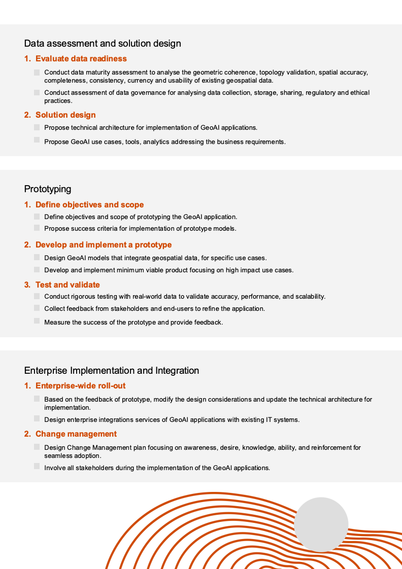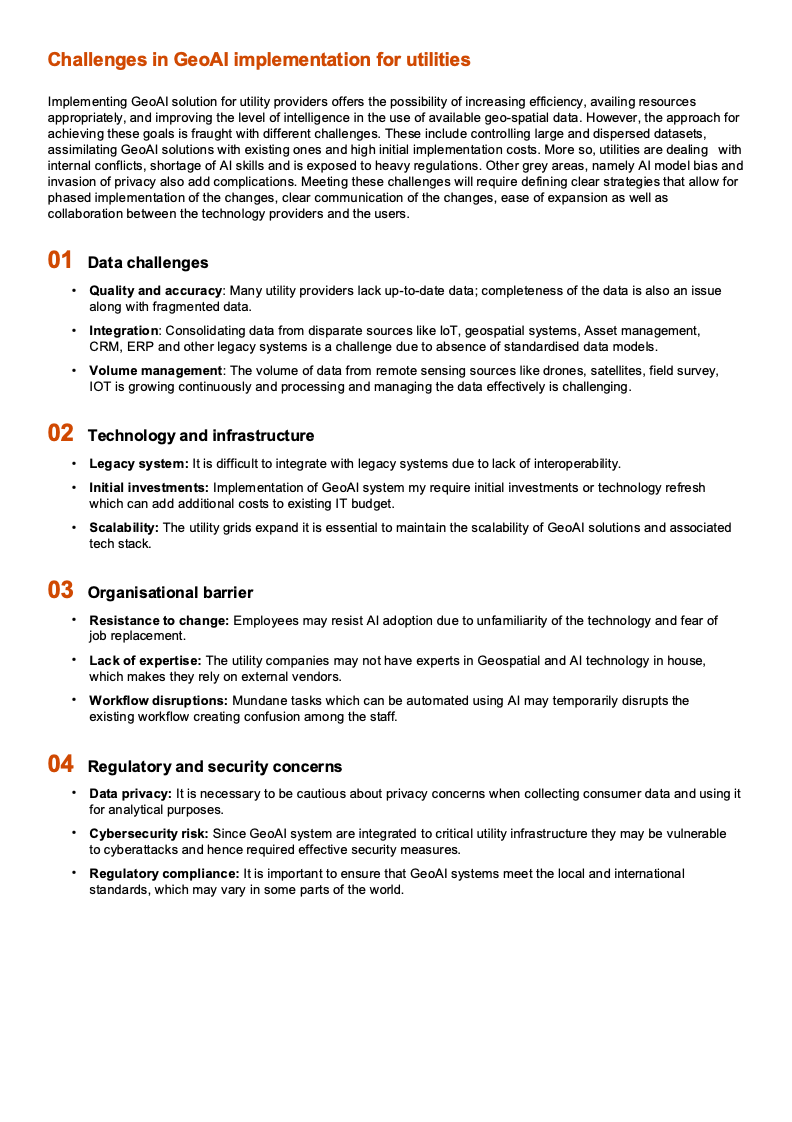 但GeoAI并非“即插即用”。报告系统梳理了实施障碍,包括数据质量参差、异构系统整合困难、前期投资压力、AI与地理空间复合型人才短缺,以及隐私与网络安全合规要求。特别是在关键基础设施领域,模型可解释性不足和潜在偏差问题,可能直接影响运营安全与公众信任。