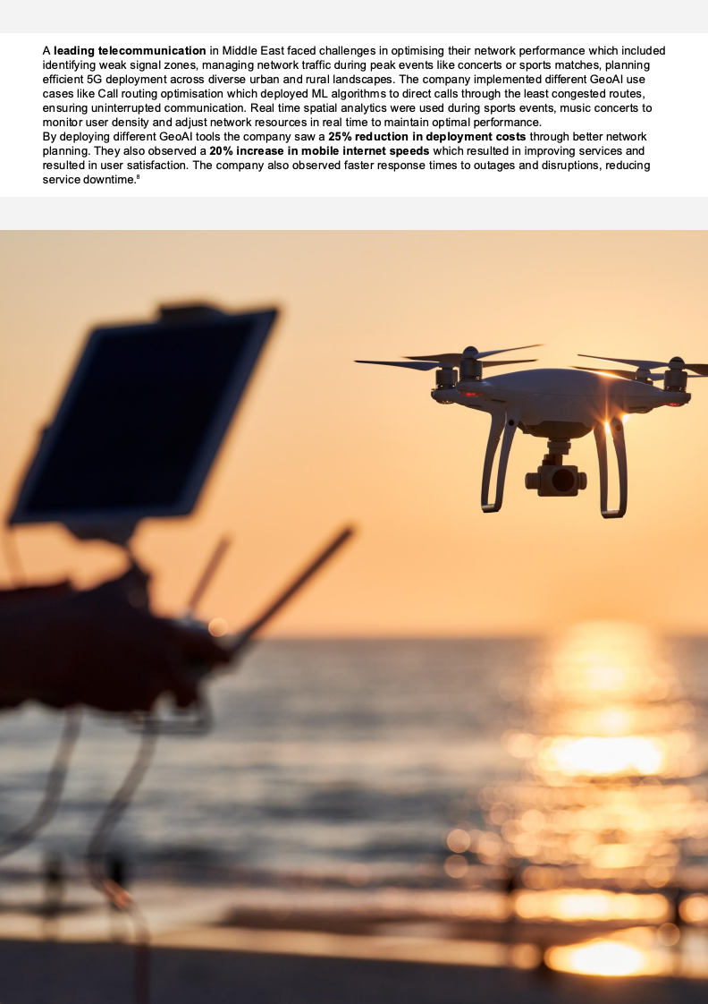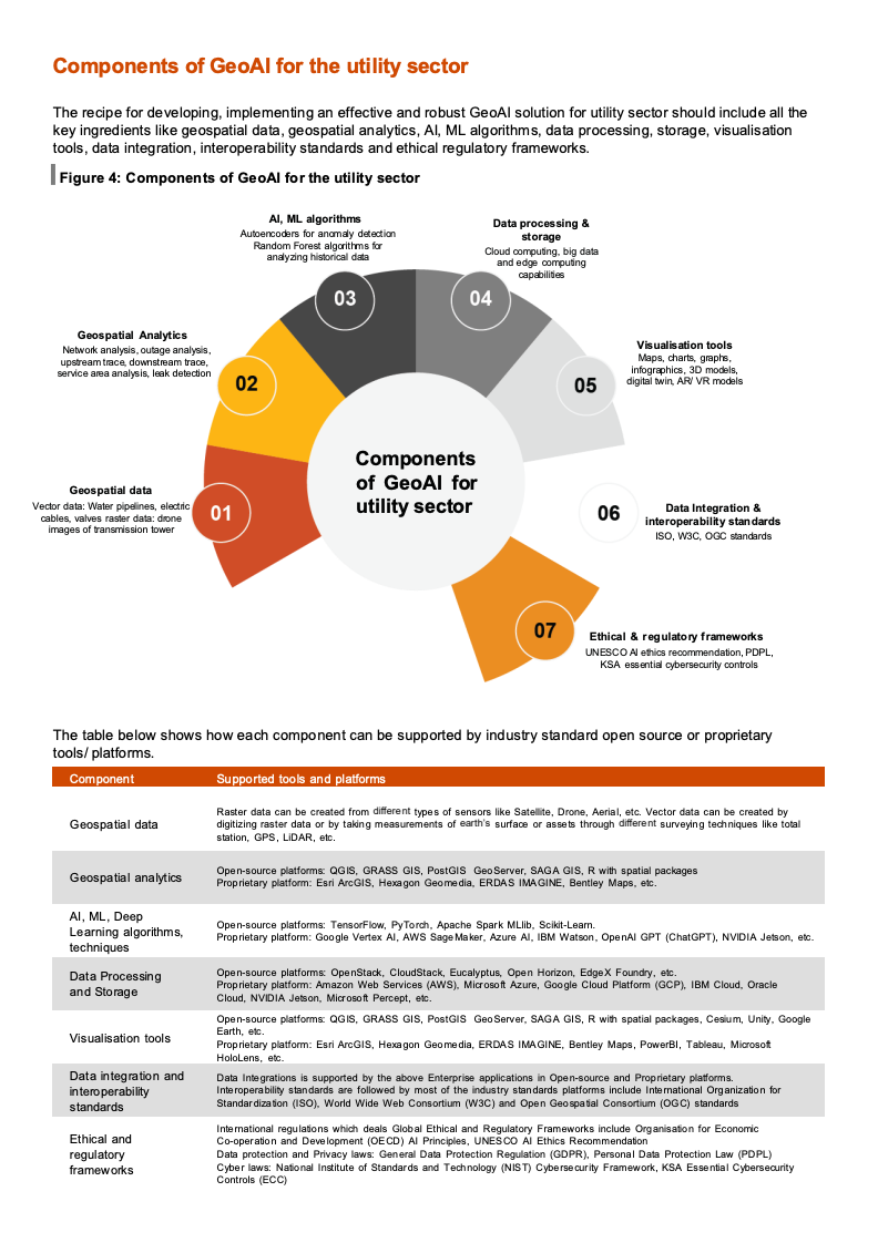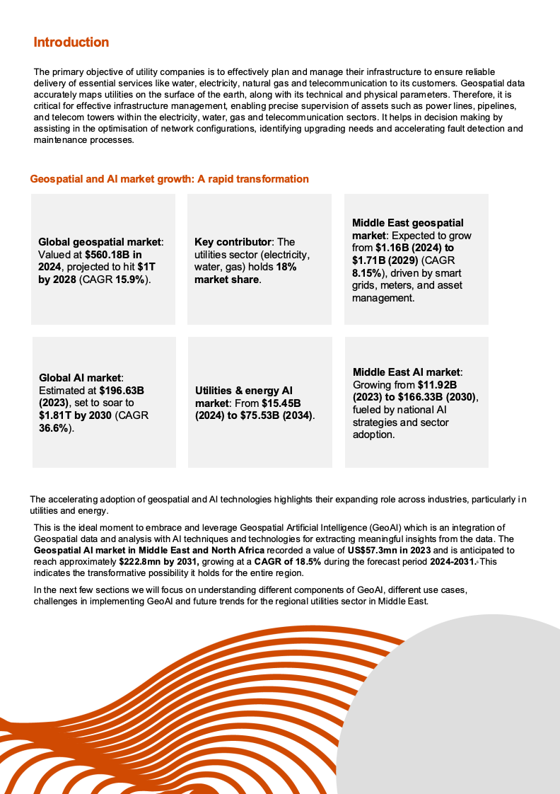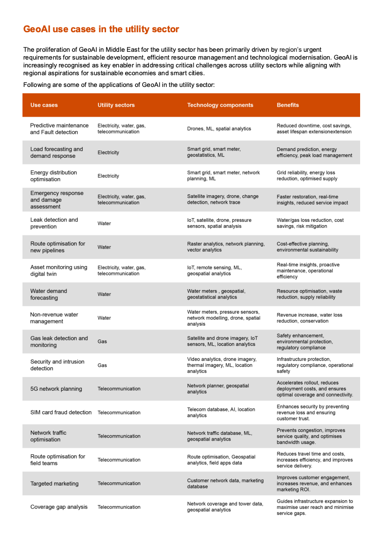 从市场数据看,GeoAI的成长动能十分明确。2024年全球地理空间市场规模约为5600亿美元,预计2028年将接近1万亿美元,年复合增长率达15.9%,其中公用事业板块占比约18%。中东地理空间市场预计将从2024年的11.6亿美元增长至2029年的17.1亿美元。与此同时,全球AI市场预计2030年达到1.81万亿美元,中东AI市场同期将从119亿美元跃升至1663亿美元。地理空间与AI双重高增长,构成GeoAI在公用事业落地的坚实宏观基础。