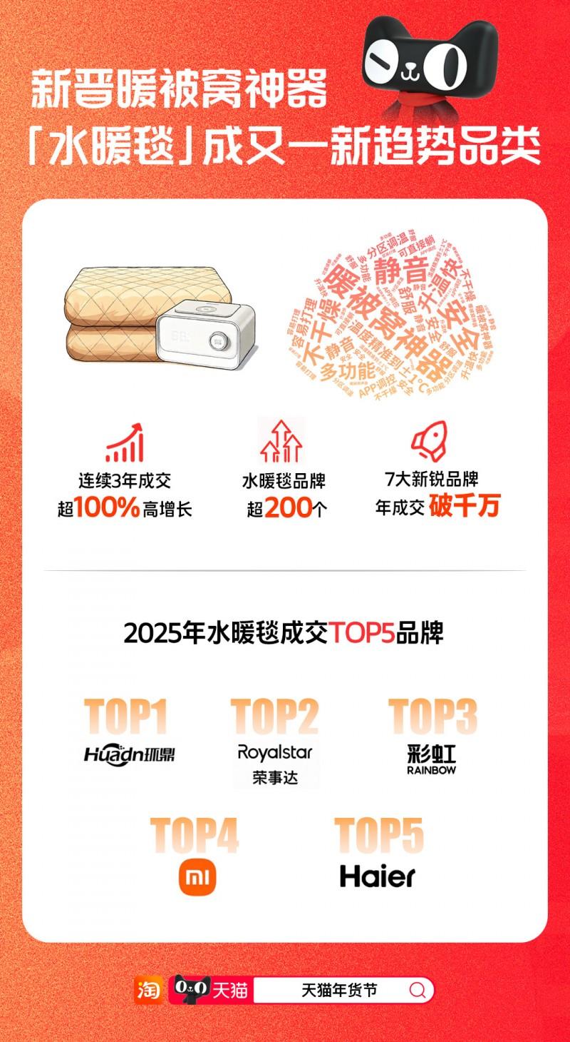 水暖毯在天猫取得了持续三年成交超100%的高增长,是家电品牌争相布局的趋势新品类。截止2025年底,有超200个品牌在天猫推出水暖毯产品,目前,环鼎、荣事达、彩虹、米家、海尔成为天猫成交TOP5品牌,米小舒、Q果等7个入驻天猫不到3年内的新品牌,在天猫实现单品类年销售额破千万;罗莱、水星等家纺品牌跨界布局水暖毯,拉动品类整体客单价提升31%。