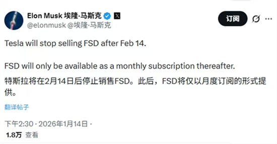 值得注意的是,此前马斯克已在 X 上宣布,2月14日起,特斯拉将取消 FSD 买断选项,仅保留月度订阅这一付费方式。