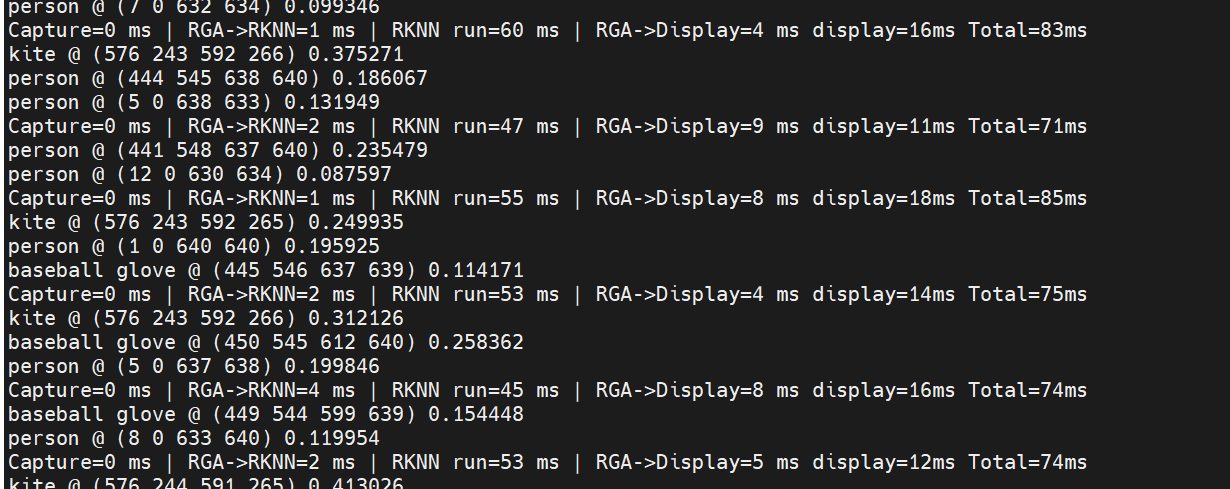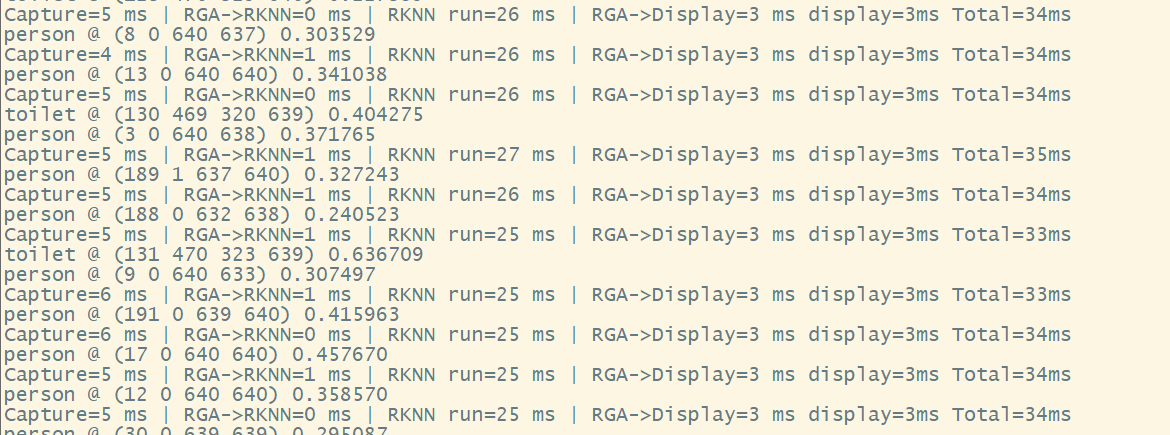 rknn_outputs_get 获取数据后即可进行内部处理,检测出目标,坐标,信心指数,根据实际需求绘制在屏幕上,这一步可以多进程异步处理,不算在串行时间内,笔者测试大概会多花8ms左右。