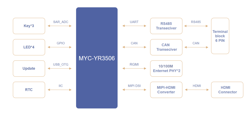 MYC-YR3506以超高性价比打破这一行业困局。它不仅原生集成完备工业接口,大幅降低硬件成本,更攻克了传统Linux系统的实时响应瓶颈;其灵活的多系统架构与完整开发平台,可让开发者以入门级投入,享受从原型验证到批量生产的全流程专业级开发服务。
