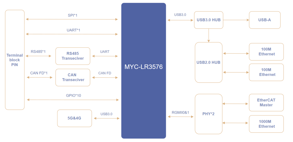 基于 MYC-LR3576 的系统方案面向工业自动化与边缘计算场景,支持 EtherCAT Master 及多网口以太网架构,实现控制网络与数据网络的有效隔离。系统通过 RS485、CAN FD 等接口接入现场设备,配合多路以太网完成高速数据汇聚与转发。依托芯片内置 6 TOPS AI 算力,可在边缘侧对工业数据进行实时分析与智能处理,适用于工业控制主站、智能产线及工业网关设备。
