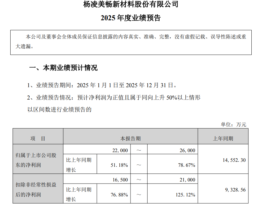1月23日,美畅股份(300861.SZ)披露2025年度业绩预告,公司预计归属于上市公司股东的净利润2.2亿元至2.6亿元,同比增长51.18%至78.67%;扣除非经常性损益后的净利润1.65亿元至2.1亿元,同比增长76.88%至125.12%。