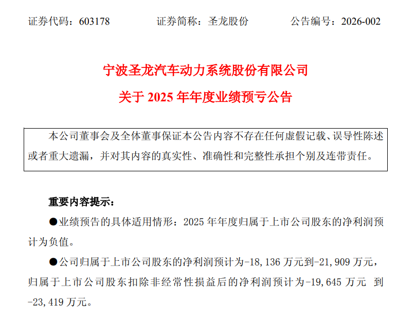 1月23日,圣龙股份(603178.SH)发布2025年年度业绩预亏公告,经财务部门初步测算,公司2025年年度将出现亏损,归属于上市公司股东的净利润预计为-1.81至-2.19亿元。