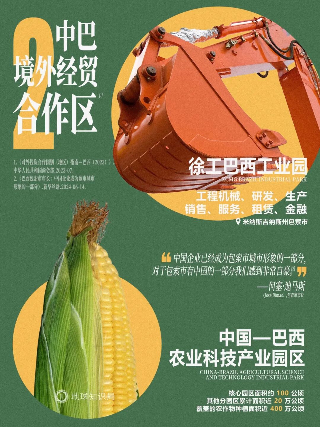 徐工集团 在米纳斯吉纳斯州包索市建立了“徐工工业园”; 隆平农业 发展有限公司 和巴西隆平高科农业发展有限公司共同发起筹建“中国—巴西农业科技产业园区”。