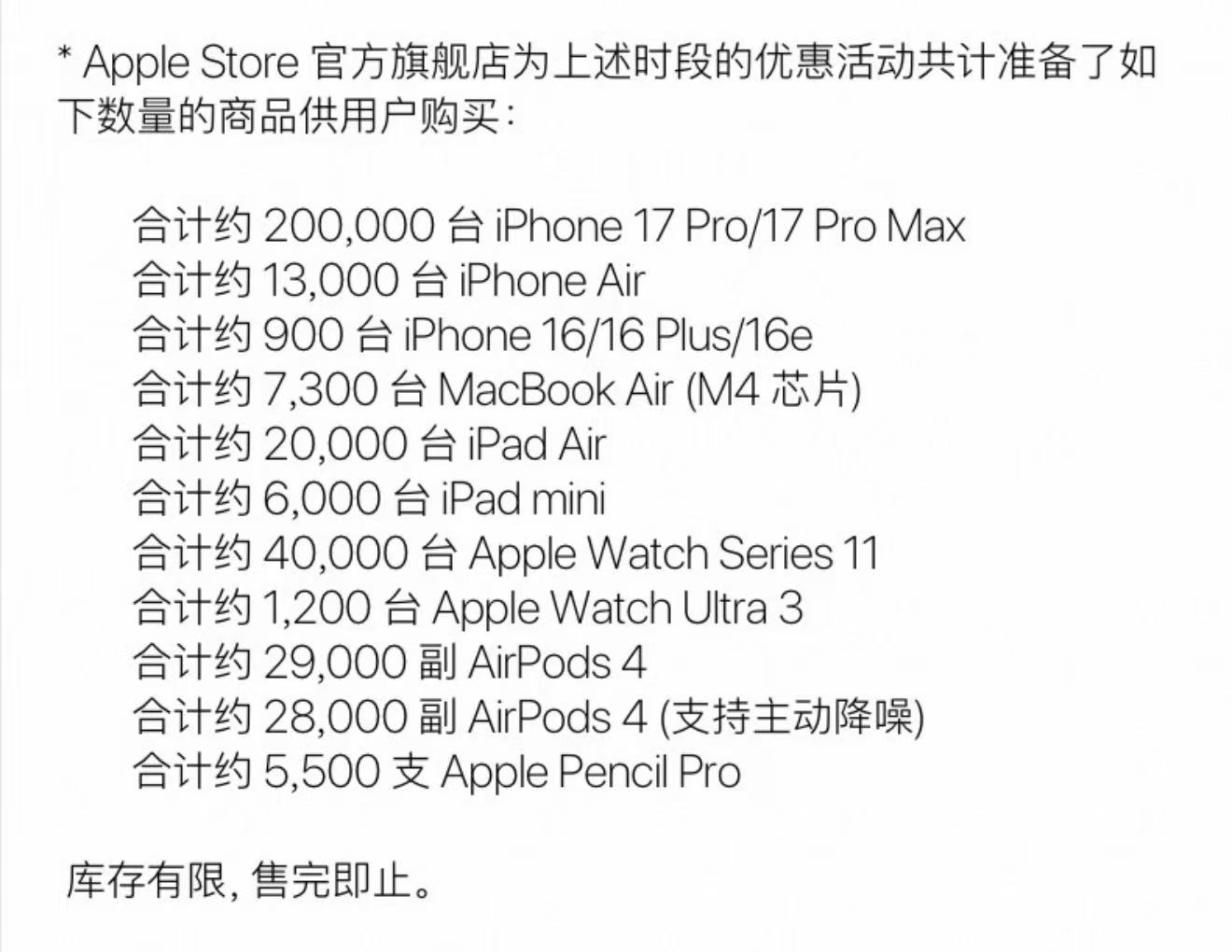 公告显示,苹果官方旗舰店为上述时段的优惠活动共计准备了这么多备货:约20万台iPhone17 Pro/17 Pro MAX,1万3千台iPhoneAir,7300台MacBookAir(M4芯片),2万台iPadAir,6000台iPad mini等。公告明确表示,库存有限,售完即止。具体见下图: