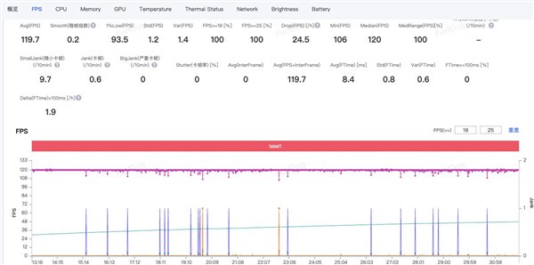 真我Neo8也并没有浪费这块165Hz的好屏幕,支持《和平精英》165Hz模式,一局30分钟的排位下来,平均帧率达到了164.3帧,稳帧指数仅有0.4。