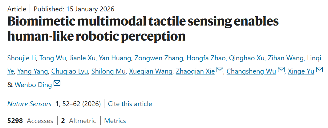 相关成果作为封面文章发表于 《Nature Sensors》 第一期,也是国内以第一单位在该期刊发表的首篇,标志着机器人触觉感知向「人类水平」迈出了关键一步。
