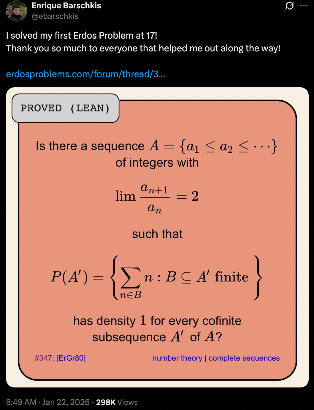 目前 Erdős Problems 网站已经将问题  #347  标记为「肯定解决」,这意味着 Enrique 的解决方案得到了数学社区的认可。