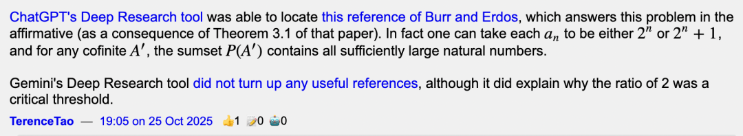 去年 10 月,著名数学家、菲尔兹奖得主陶哲轩在 Erdős 问题网站的讨论区里,用 ChatGPT 搜索相关文献,找到了一篇 Burr 和 Erdős 的旧论文。