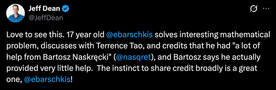谷歌的 Jeff Dean 也转发了这条消息:「爱看这种事,17 岁的 Enrique 解决了一个有趣的数学问题,与陶哲轩讨论,并感谢 Bartosz Naskręcki 给予的 『 大量帮助  ,而 Bartosz 说他实际上提供的帮助很少。这种广泛分享荣誉的本能真是太棒了!」