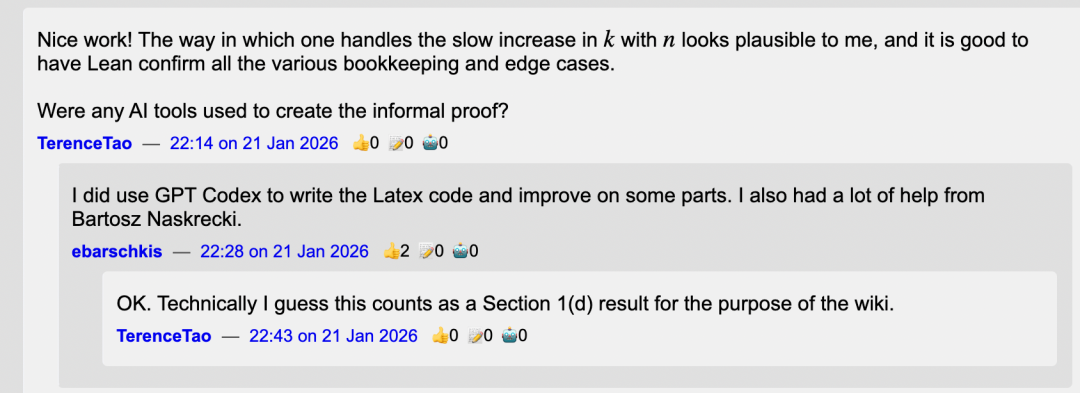 他随即询问:「创建非形式证明时使用了 AI 工具吗?」Enrique 坦诚地回答,他使用了 GPT Codex 来编写 LaTeX 代码并改进部分内容,同时得到了数学家 Bartosz Naskręcki 的大量帮助。