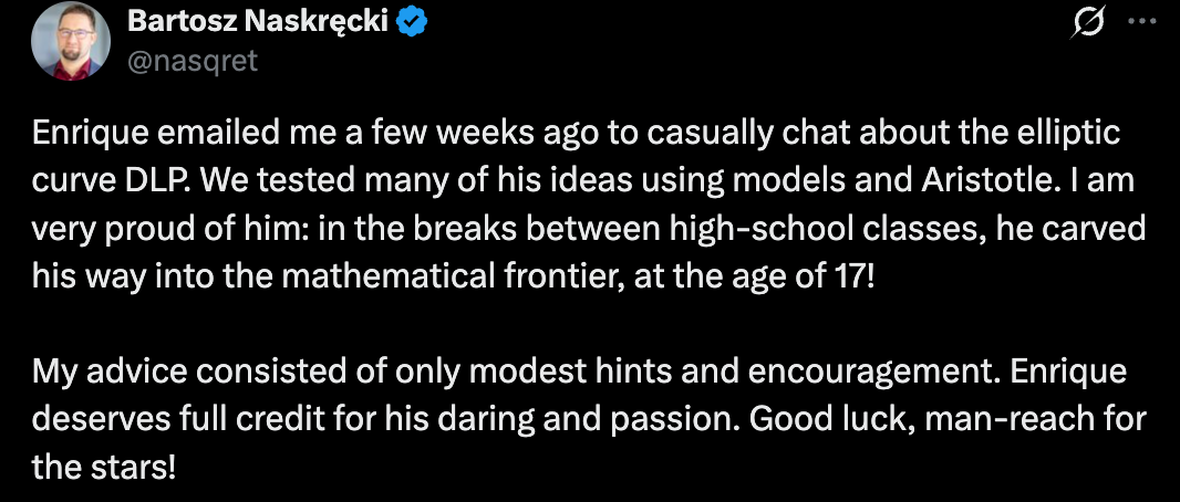 Bartosz Naskręcki 随后转发并评论:「Enrique 几周前给我发邮件,随意聊了聊椭圆曲线离散对数问题。我们用模型和 Aristotle 测试了他的许多想法。我为他感到非常自豪,在高中课间休息的间隙,他在 17 岁时就开辟了通往数学前沿的道路!我的建议只包含适度的提示和鼓励。Enrique 理应获得全部荣誉,他的勇气和热情值得赞扬。好运,伙计 —— 向星辰进发!」