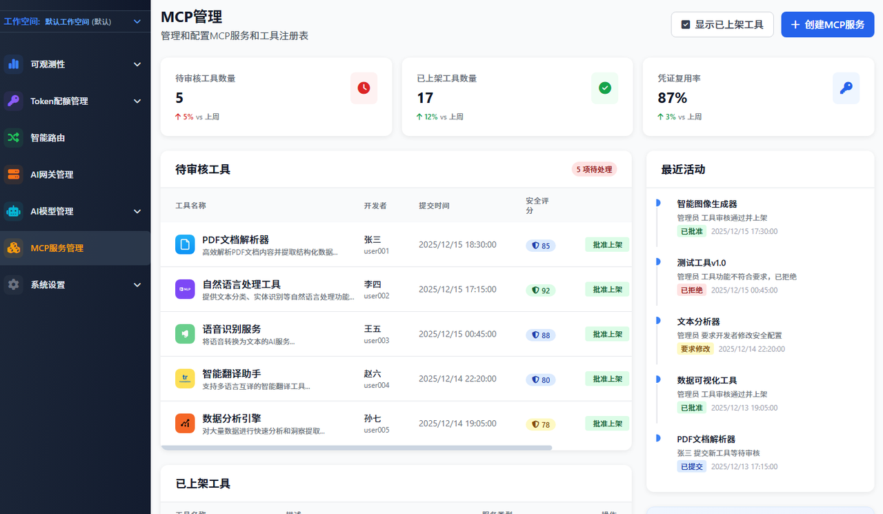 提供集中式的 MCP 工具注册表。管理员可以统一审核、上架和分发工具,终结 “ 凭证泛滥 ” 。开发者则可以从受信清单中直接选用工具,将集成时间从数周缩短至几分钟。