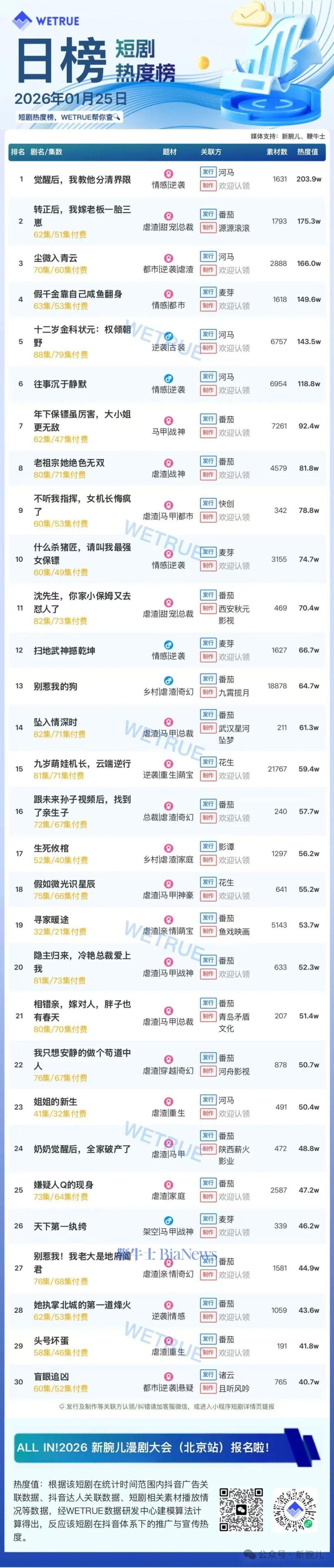 25日短剧热度榜:《觉醒后,我教他分清界限》第一,大盘热度4255万