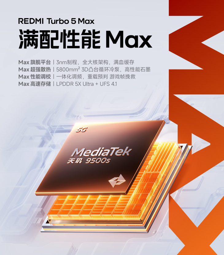 性能上的碾压式投入,是Turbo 5 Max叫板旗舰的底气。作为系列首款搭载天玑9000正代旗舰芯的机型,它全球首发天玑9500s,台积电3nm制程加持下,形成“1+3+4”全大核架构,安兔兔跑分直接冲到361万分。要知道同价位机型跑分多在250万分左右,即便是4000价格档位部分旗舰,也难稳超这个成绩。