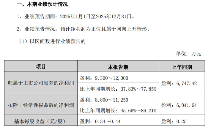 业绩预告显示,2025 年 1 月 1 日至 12 月 31 日期间,公司预计归属于上市公司股东的净利润为 9300 万元至 12000 万元,较上年同期的 6747.42 万元增长 37.83% 至 77.85%;扣除非经常性损益后的净利润预计为 8800 万元至 11250 万元,较上年同期的 6041.64 万元增长 45.66% 至 86.21%;基本每股收益预计为 0.34 元 / 股至 0.44 元 / 股,上年同期为 0.25 元 / 股。