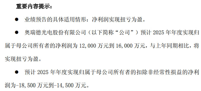 2026 年 1 月 26 日,奥瑞德光电股份有限公司(证券代码:600666,证券简称:奥瑞德)发布 2025 年年度业绩预盈公告(公告编号:临 2026-005)。经公司财务部门初步测算,预计 2025 年年度实现归属于母公司所有者的净利润为 12,000 万元到 16,000 万元,与上年同期相比实现扭亏为盈;预计同期归属于母公司所有者的扣除非经常性损益的净利润为 – 18,500 万元到 – 14,500 万元。需要注意的是,本次业绩预告数据未经注册会计师审计。