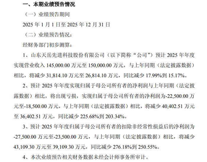 1 月 26 日,山东天岳先进科技股份有限公司(A 股证券代码:688234;港股证券代码:02631,简称 “天岳先进”)发布 2025 年年度业绩预告(公告编号:2026-002)。公告显示,公司 2025 年营收同比下滑,归属于母公司所有者的净利润及扣非后净利润均出现亏损,业绩表现较上年同期有所下滑。