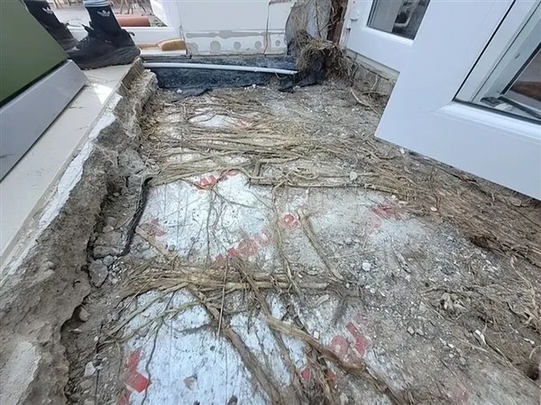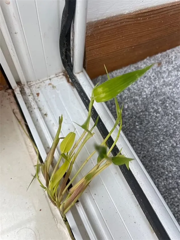 最早发现异常是在2025年5月,他们注意到阳光房和花园门槛连接处长了一小撮植物,还以为只是杂草,后来才意识到是竹子拱出来了。