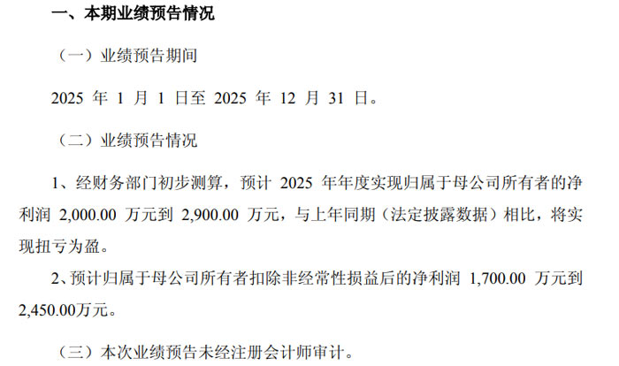 业绩预告显示,报告期为 2025 年 1 月 1 日至 12 月 31 日,经公司财务部门初步测算,预计 2025 年年度归属于母公司所有者的净利润为 2000.00 万元至 2900.00 万元,相较于上年同期法定披露数据实现扭亏为盈;预计归属于母公司所有者扣除非经常性损益后的净利润为 1700.00 万元至 2450.00 万元。需要说明的是,本次业绩预告尚未经注册会计师审计。