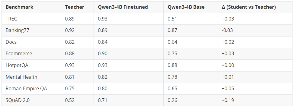 经过微调的 4B 学生模型在 6 项基准测试上超越了 120B+ 参数的教师模型,在 1 项(HotpotQA)上持平,仅在 1 项(Banking77)上略微落后(差距在误差范围内)。提升最显著的是 SQuAD 2.0 闭卷问答任务,学生模型比教师模型高出 19 个百分点 —— 这充分证明,微调比单纯依赖提示词(prompting)能更有效地将领域知识注入模型。