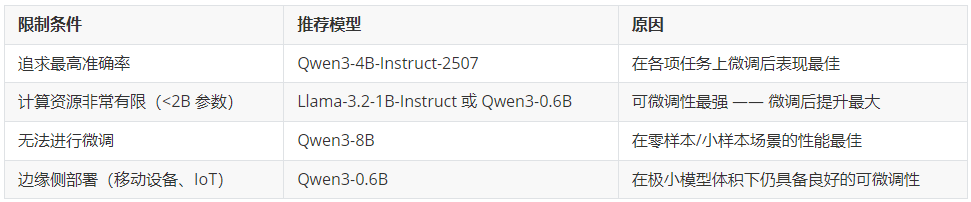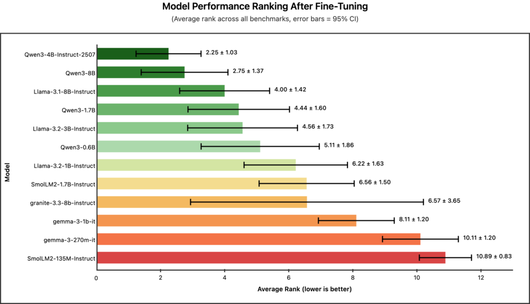 微调后性能最佳的模型:Qwen3 系列模型在微调后始终表现最强,其中 4B 版本整体表现最优。如果你的目标是在特定任务上获得最高准确率,Qwen3-4B 就是你的首选。