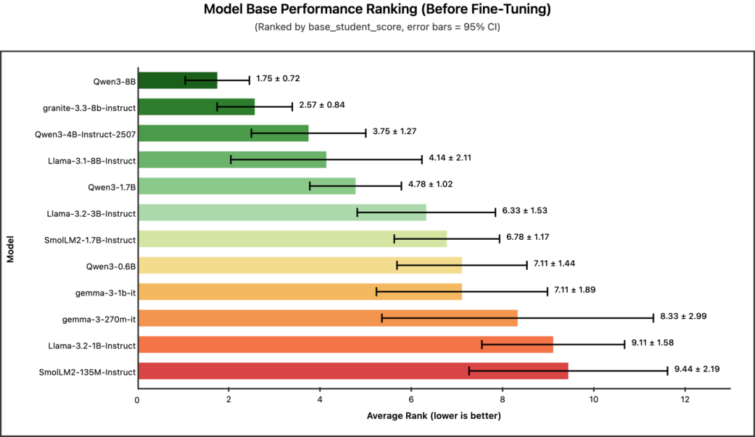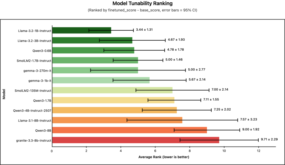 有趣的是,可微调性排名与模型大小的排序正好相反。像 Llama-3.2-1B 和 Qwen3-0.6B 这样的小型模型,从微调中获得的提升最大。而规模最大的模型(如 Qwen3-8B、granite-3.3-8b)在可微调性排名中接近垫底 —— 这并非因为它们表现差,而是因为它们起点相对较高,进步空间相对有限。