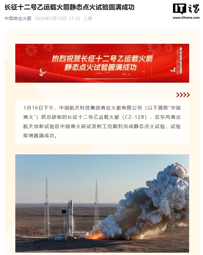 据IT之家了解,中国航天科技集团商业火箭有限公司(简称“中国商火”)是中国航天科技集团旗下专注于商业火箭研发与发射服务的国有控股企业。2026 年 1 月 16 日,中国商火在东风商业航天创新试验区的自主研试发射工位,成功完成了长征十二号乙运载火箭(CZ-12B)的静态点火试验。长征十二号乙是为满足我国低轨星座组网等商业发射需求研制的新一代 4 米级可重复使用火箭,采用两级构型及全液氧煤油动力方案,具备 20 吨级近地轨道运载能力。