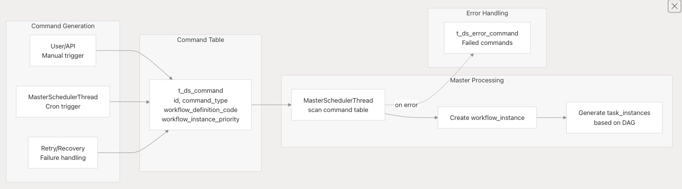 t_ds_command 表实现了基于队列的执行模型,其中命令触发工作流实例。