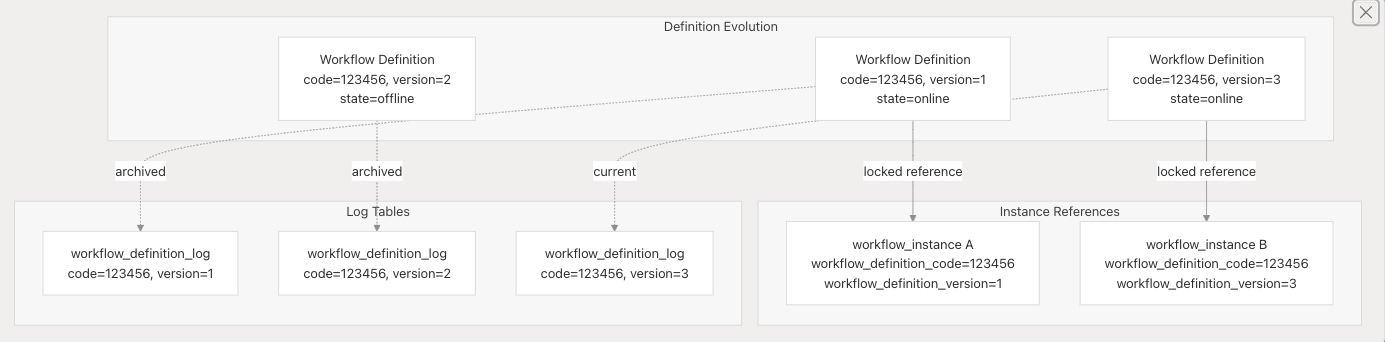 - 基于代码的标识:工作流和任务都使用代码(bigint)作为跨版本的稳定标识符。