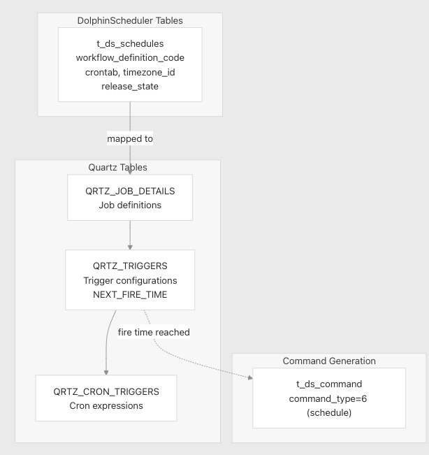 | 调度 | 通过 Quartz 管理基于 cron 的调度 | t_ds_schedules、QRTZ_* 表 |