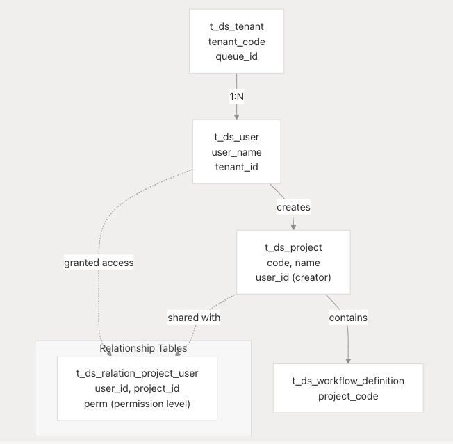 | 管理 | 用户、租户、项目和权限 | t_ds_user、t_ds_tenant、t_ds_project |