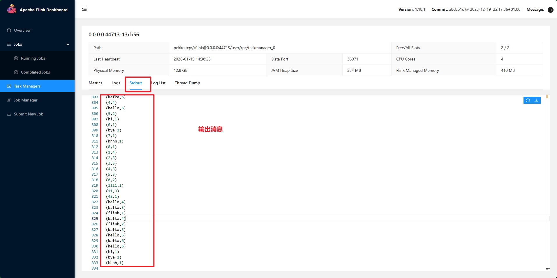 在虚拟机启动生产者,输出字符串,然后可以在Flink查看输出Kafka生产的消息: