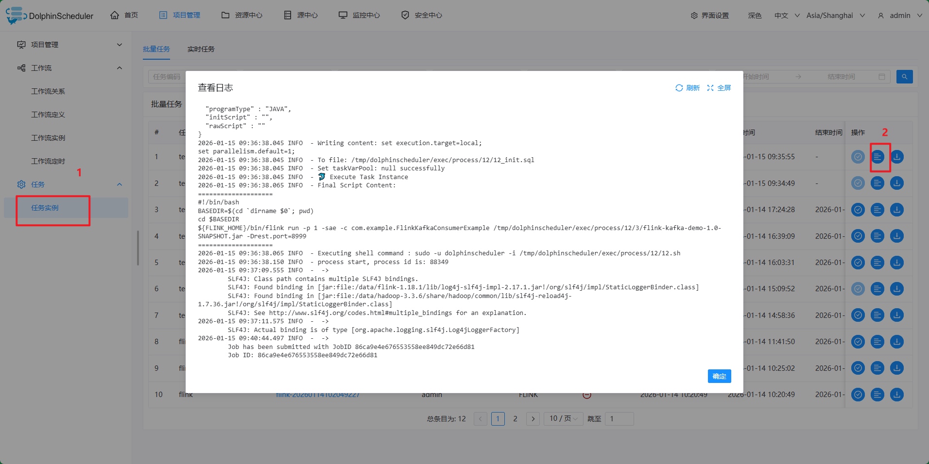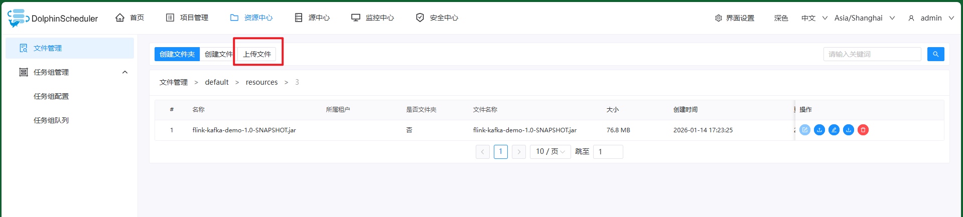 用Flink消费Kafka数据,然后打包上传到Apache DolphinScheduler,启动Flink任务: