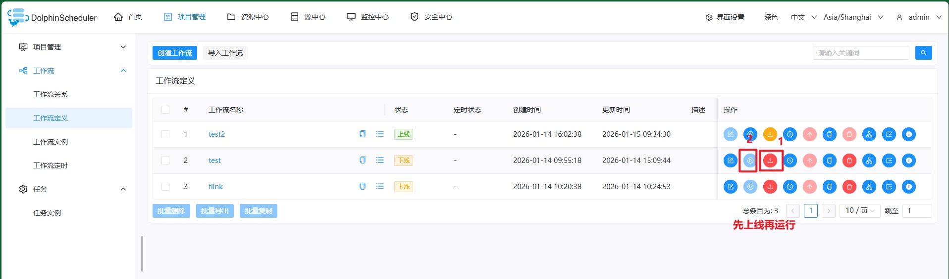 Apache DolphinScheduler用的是单机部署,具体操作可以参考官方文档:DolphinScheduler | 文档中心(https://dolphinscheduler.apache.org/zh-cn/docs/3.3.2/guide/installation/standalone).