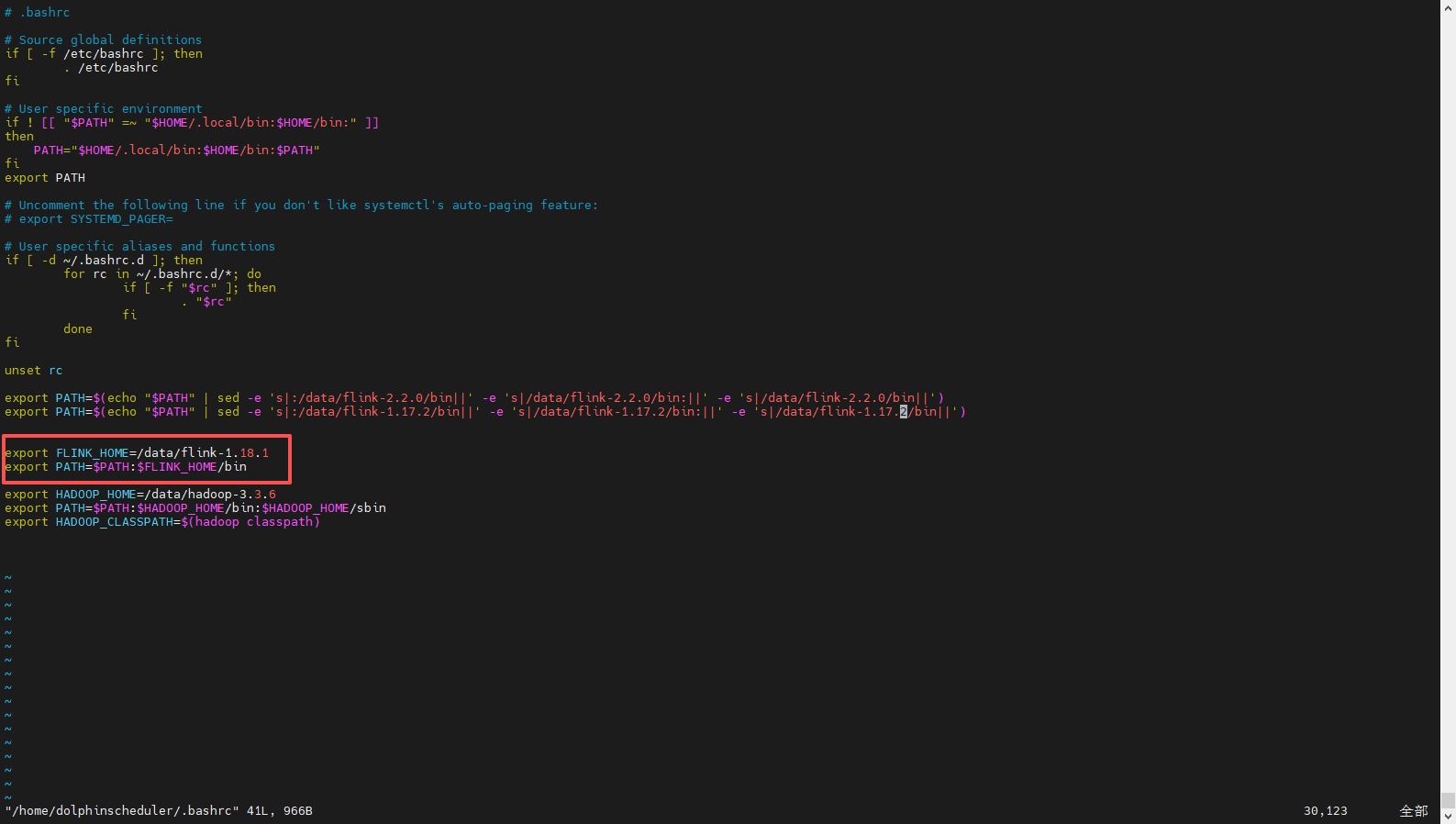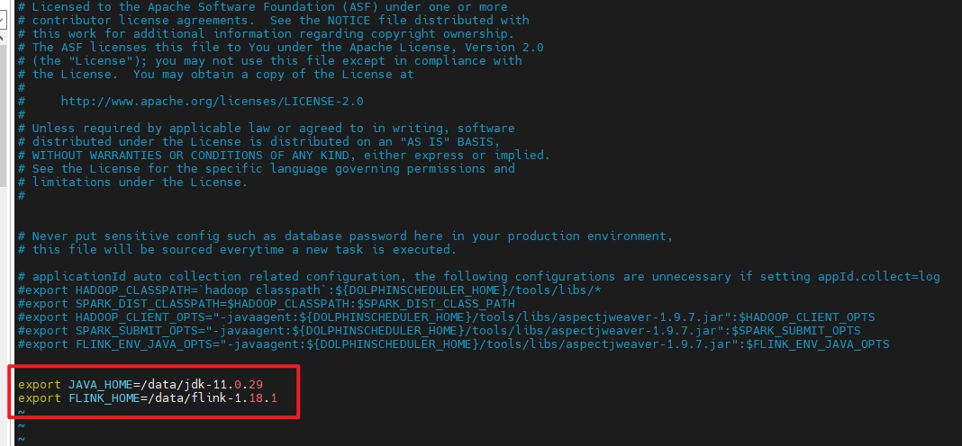 修改dolphinscheduler_env.sh文件,新增JAVA、Flink路径: