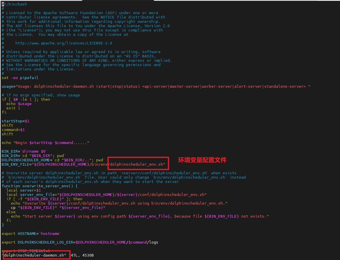dolphinscheduler-daemon.sh可以看出,配置环境变量用的是bin/env文件夹下的dolphinscheduler_env.sh。
