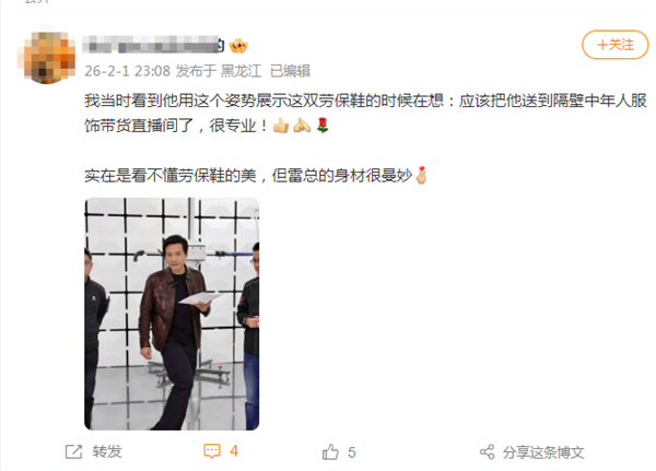 有网友打趣称:我当时看到他用这个姿势展示这双劳保鞋的时候在想:应该把他送到隔壁中年人服饰带货直播间了,很专业!实在是看不懂劳保鞋的美,但雷总的身材很曼妙。