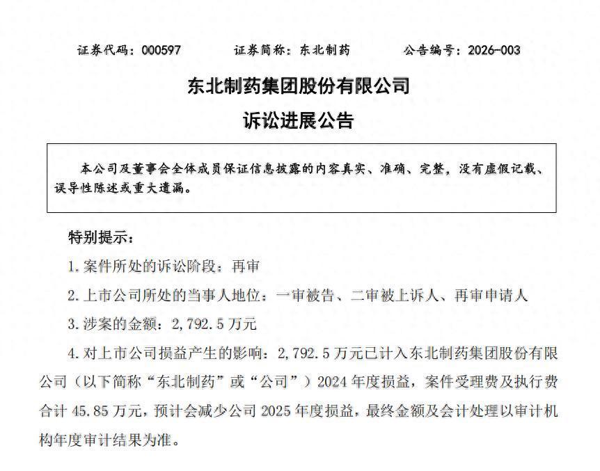 据悉,该案源于2016年的合同纠纷,涉案金额为2792.5万元。根据公告,该笔诉讼赔款已计入公司2024年度损益。东北制药强调,案件受理费及执行费合计45.85万元预计将减少公司2025年度损益。