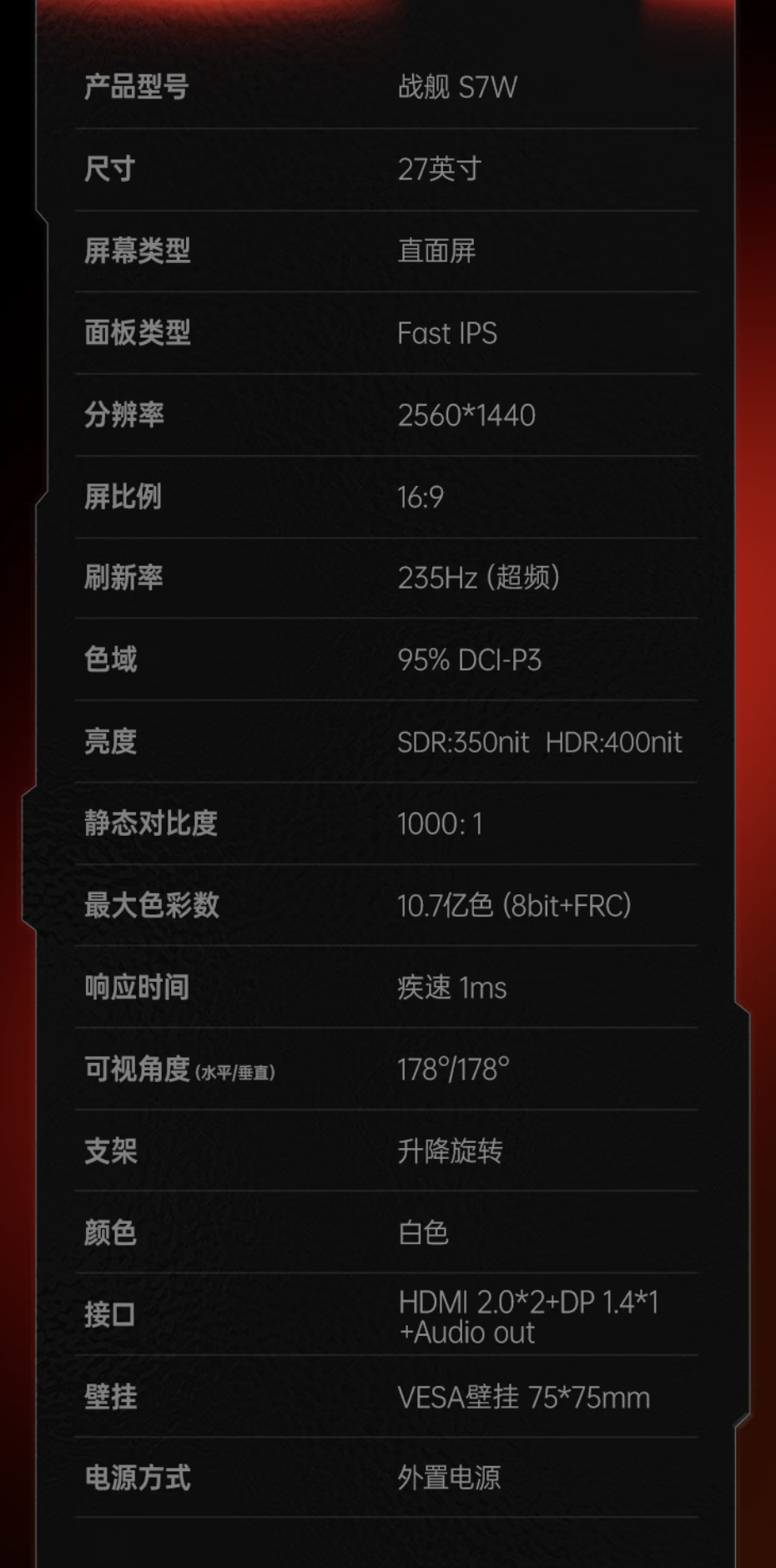 该机配备一块 2560×1440 分辨率 235Hz 超频 Fast IPS 面板,显示器 SDR 亮度 350 尼特,HDR 亮度 400 尼特,静态对比度 1000:1,显示器支持 10-Bit 色彩(8-Bit + FRC),覆盖 95% DCI-P3 色域。