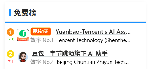截至2月1日下午,据APP数据分析平台appark显示,元宝在苹果中国区App Store免费榜的排名已上升5位,登顶榜首。紧随其后的是字节跳动旗下AI应用“豆包”,此前该产品已连续霸榜16天。