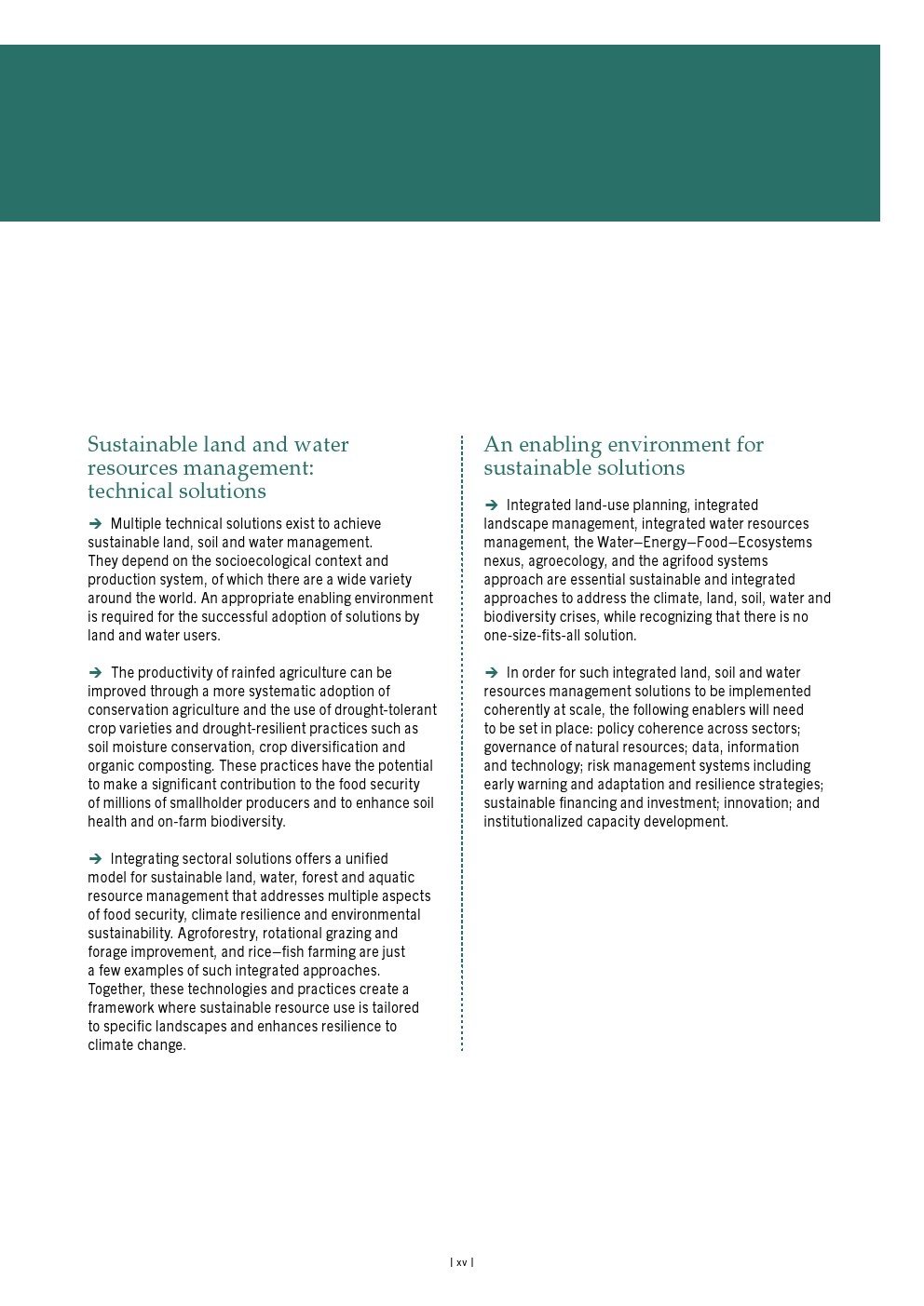 任何旨在实现可持续农业生产及土地与水资源管理的战略,都需要对这些关键资源的管理方式进行深刻转变,并以准确的信息和资金为支撑,辅以自然资源管理行业之外的协同努力和举措。在气候变化这一具体且关键的领域,目前投资和气候融资不足的水平需要得到提升。同样重要的是要牢记,任何旨在减缓气候变化的措施都必须经过周密规划,以避免适应不当或产生意外后果,包括对稀缺水资源造成额外压力或导致土地和土壤资源的进一步退化。
