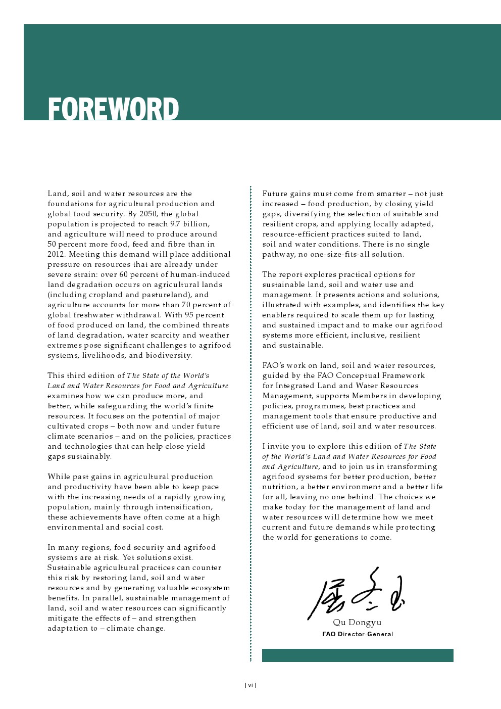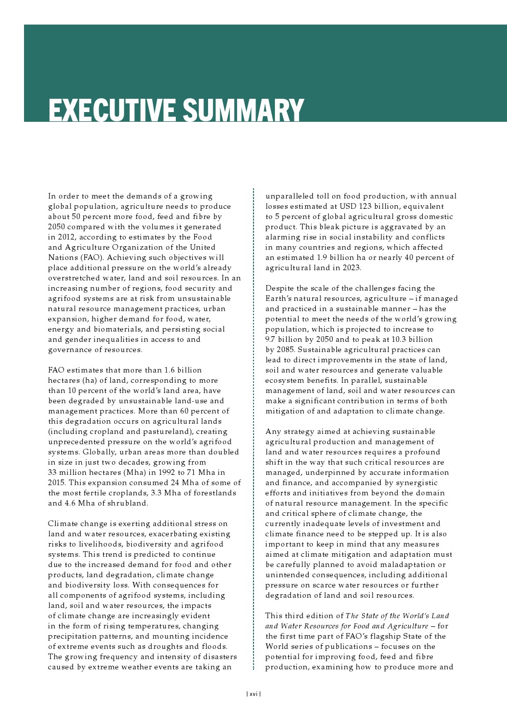 尽管地球自然资源面临挑战规模巨大,但若以可持续方式管理和实践,农业仍有潜力满足全球不断增长人口的需求——预计人口到2050年将增至97亿,并在2085年达到103亿的峰值。可持续农业实践可以直接改善土地、土壤和水资源的状况,并产生宝贵的生态系统效益。同时,对土地、土壤和水资源的可持续管理可以在气候变化的减缓和适应两方面做出重大贡献。