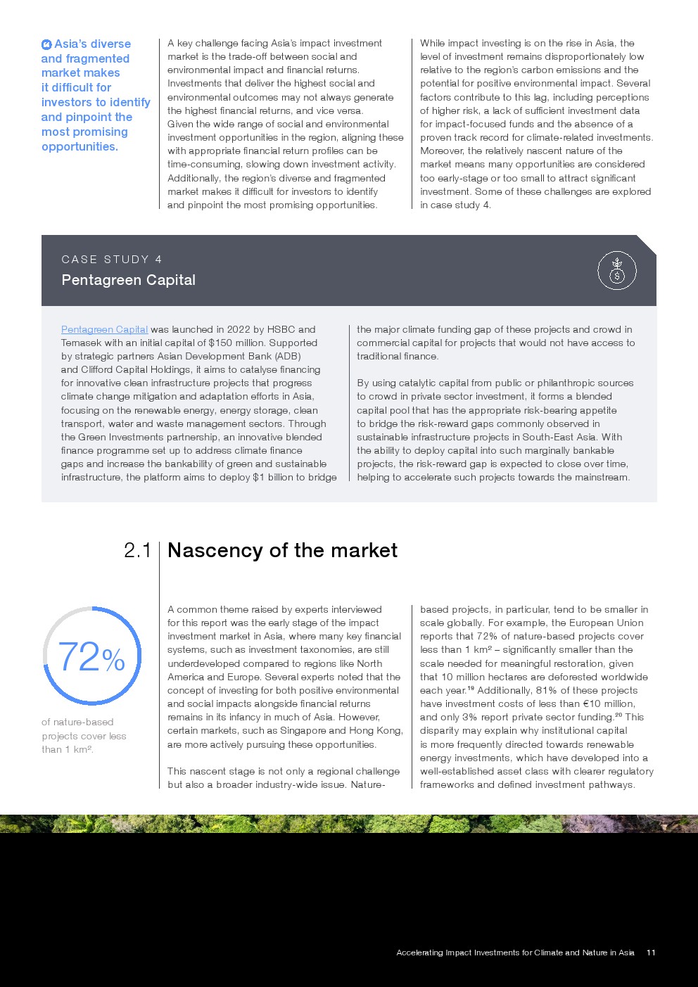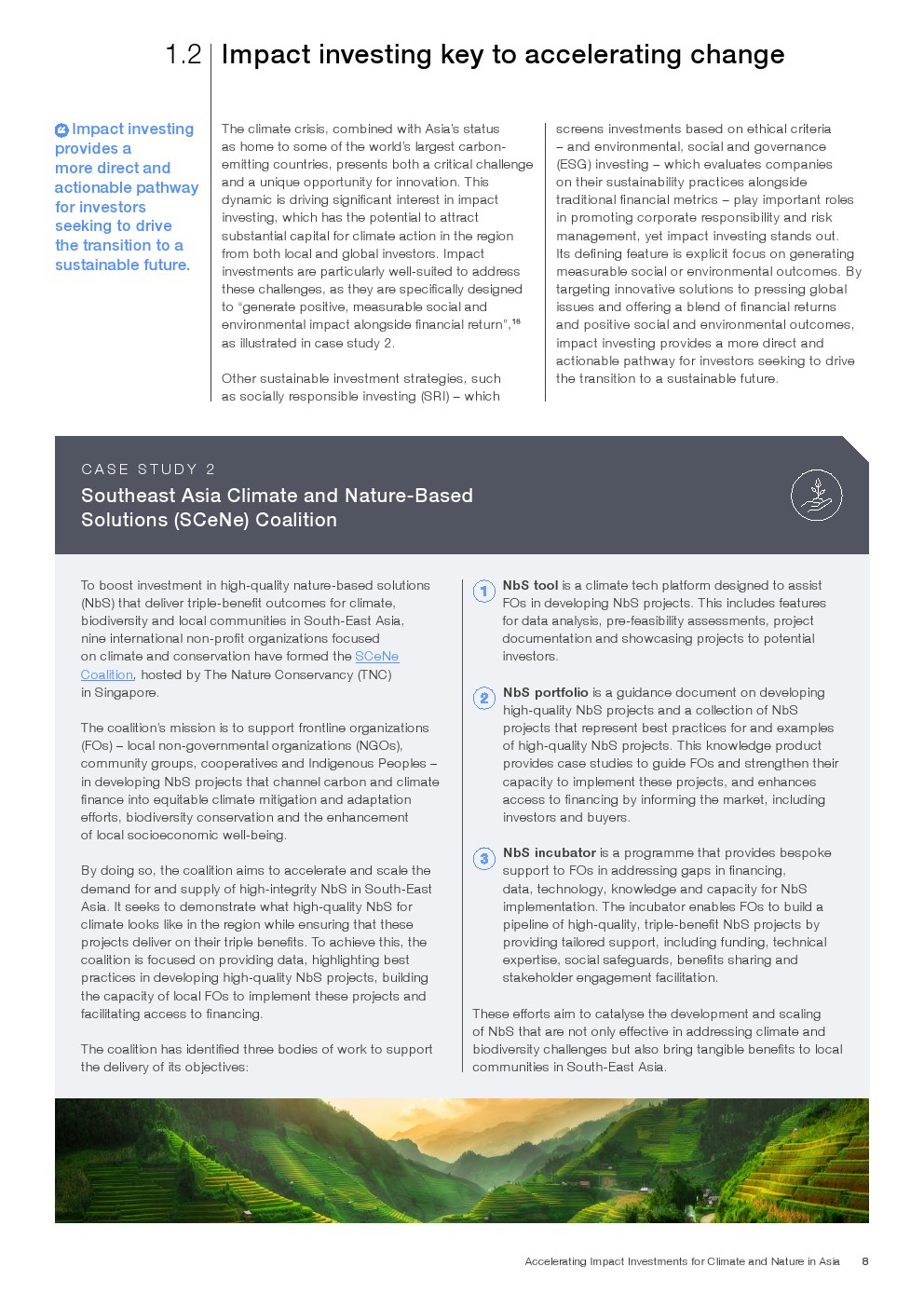 相较于欧美成熟市场,亚洲的影响力投资生态仍处于早期阶段。但得益于多元的气候与自然解决方案,该地区正吸引越来越多关注。先行者通过创新混合金融结构降低风险、提升项目可融资性,从而引导更多资本进入。市场不成熟、数据匮乏及高风险认知等挑战,仍阻碍着兼具可量化正向影响与财务回报的优质投资机会识别。