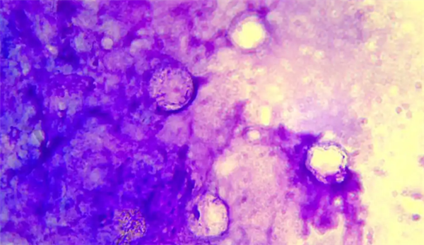 随后她转至广西医科大学第二附属医院,经角膜病专家详细检查,在角膜刮片中观察到大量棘阿米巴包囊,确诊为棘阿米巴角膜炎。