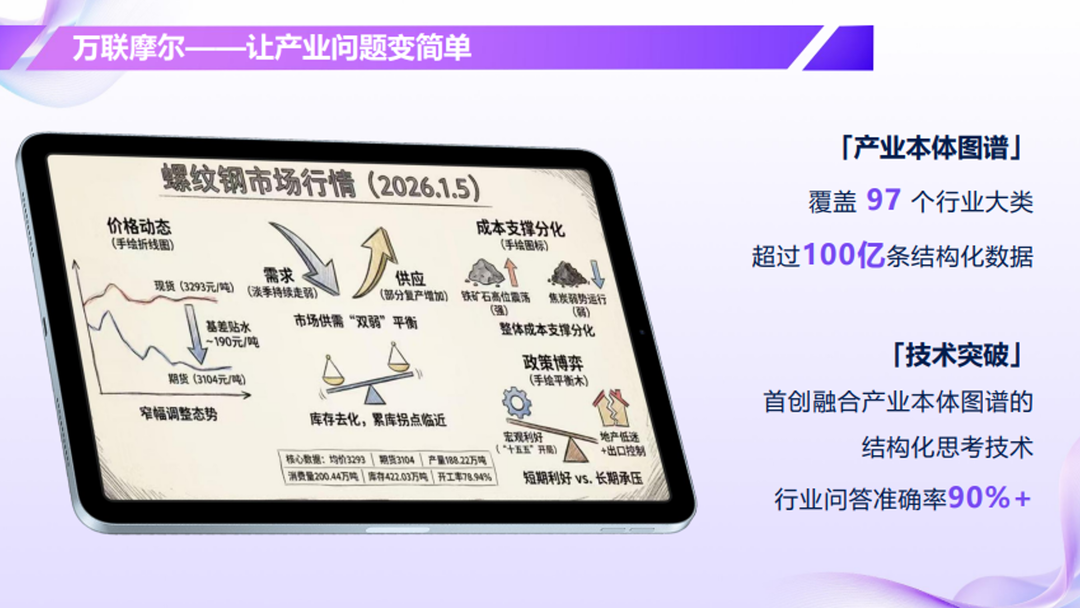面对AI技术与产业场景断链、商业闭环难通等深层次挑战,万联易达集团副总裁杜新凯表示,AI+不是技术独奏,而是产业与AI的双向奔赴。“我们面向全产业打造的产业AI大模型万联摩尔,并提出了构建产业AI超级载体的解决方案。”杜新凯介绍,所谓“全产业”,即打破单一行业局限,覆盖工业、农业、服务业等全领域,实现跨产业链的知识整合与协同。